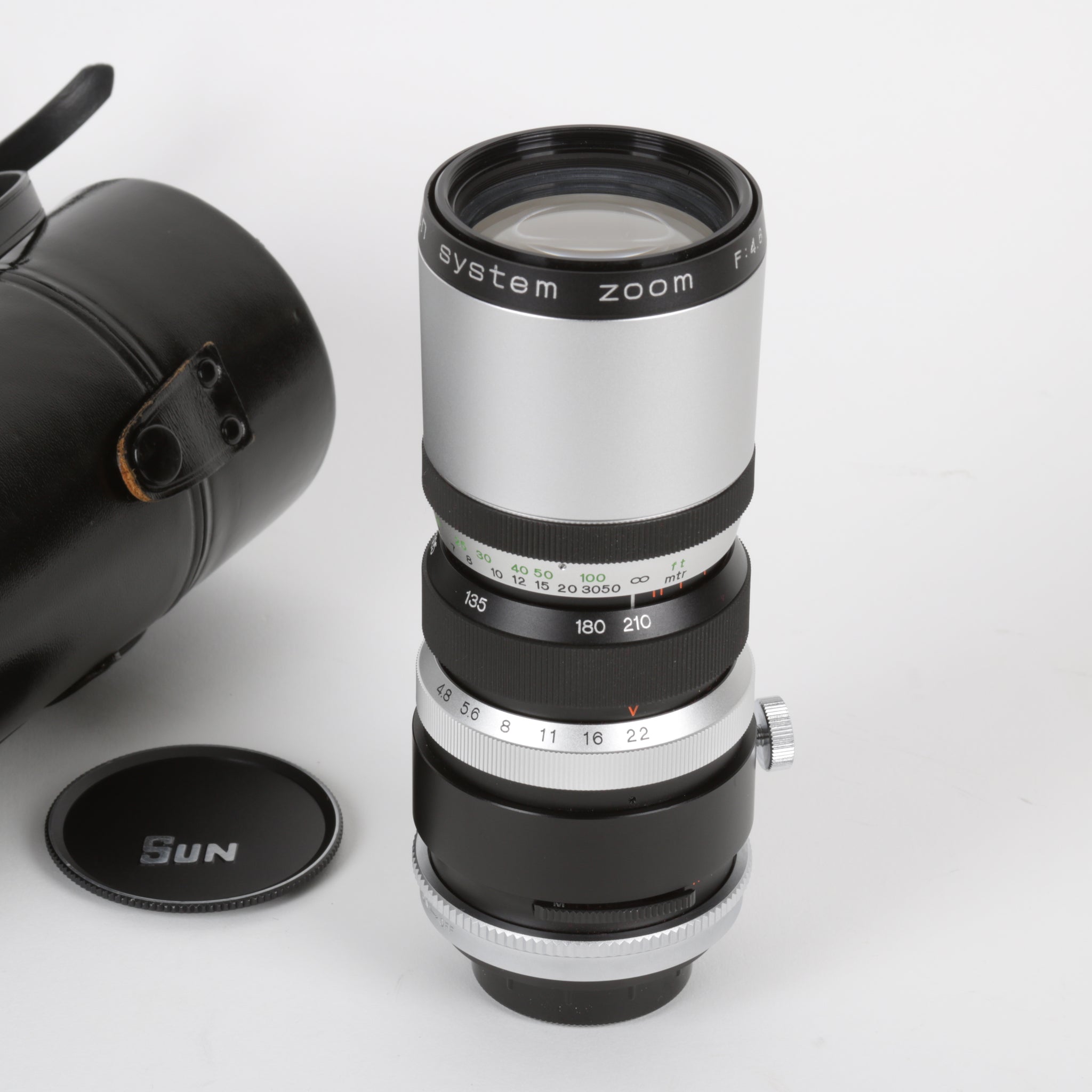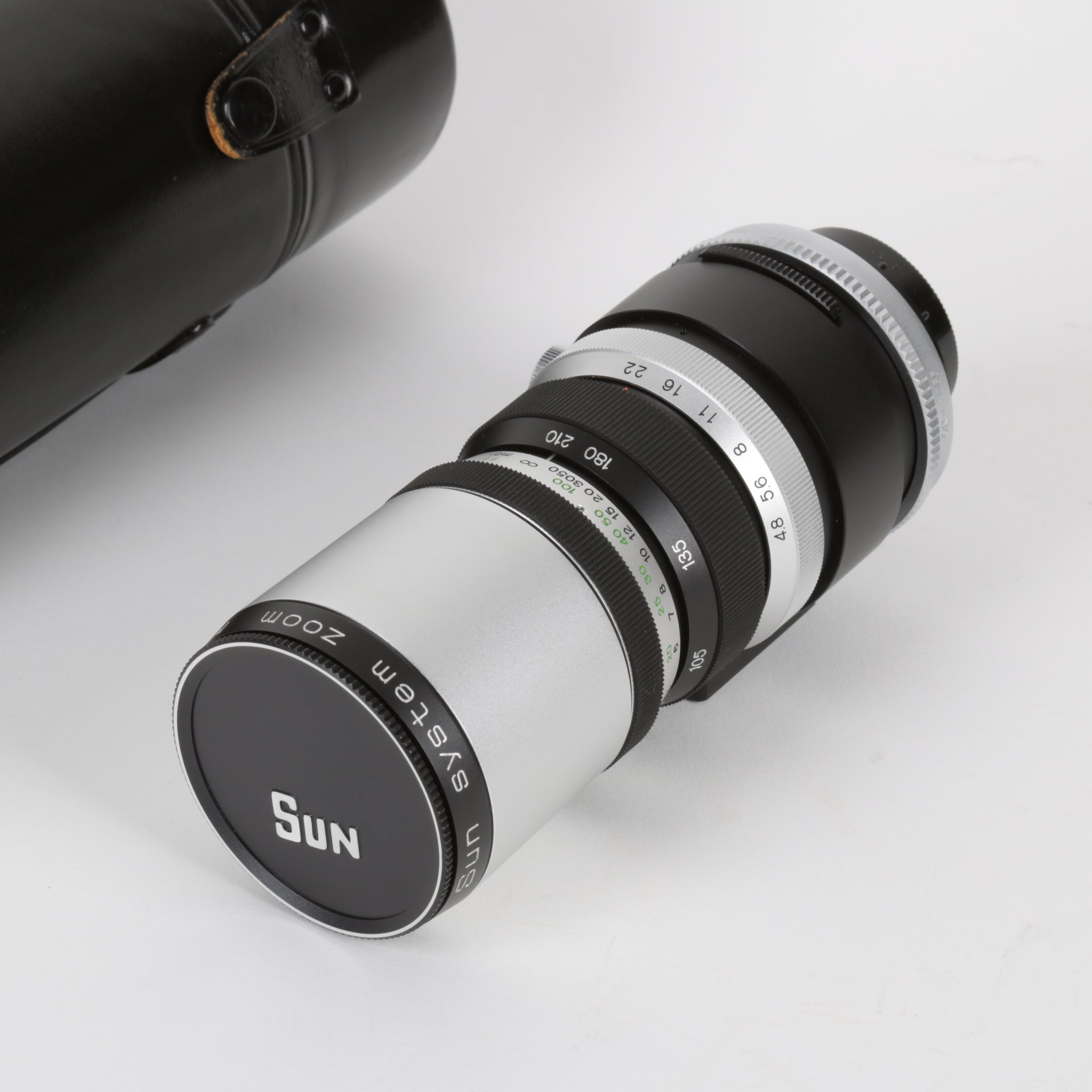 Vintage Sun 85-210 f4.8 Zoom Lens, M42 screw type mount. Precision construction and movement, made in Japan. This exceptional example of early 1970's Japanese lenses showcases Sun's commitment to making world class camera equipment. Minimalist design, stand-out image sharpness, precision feel, and boutique, machined construction. This is a fully manual lens with the standard auto / manual aperture button.