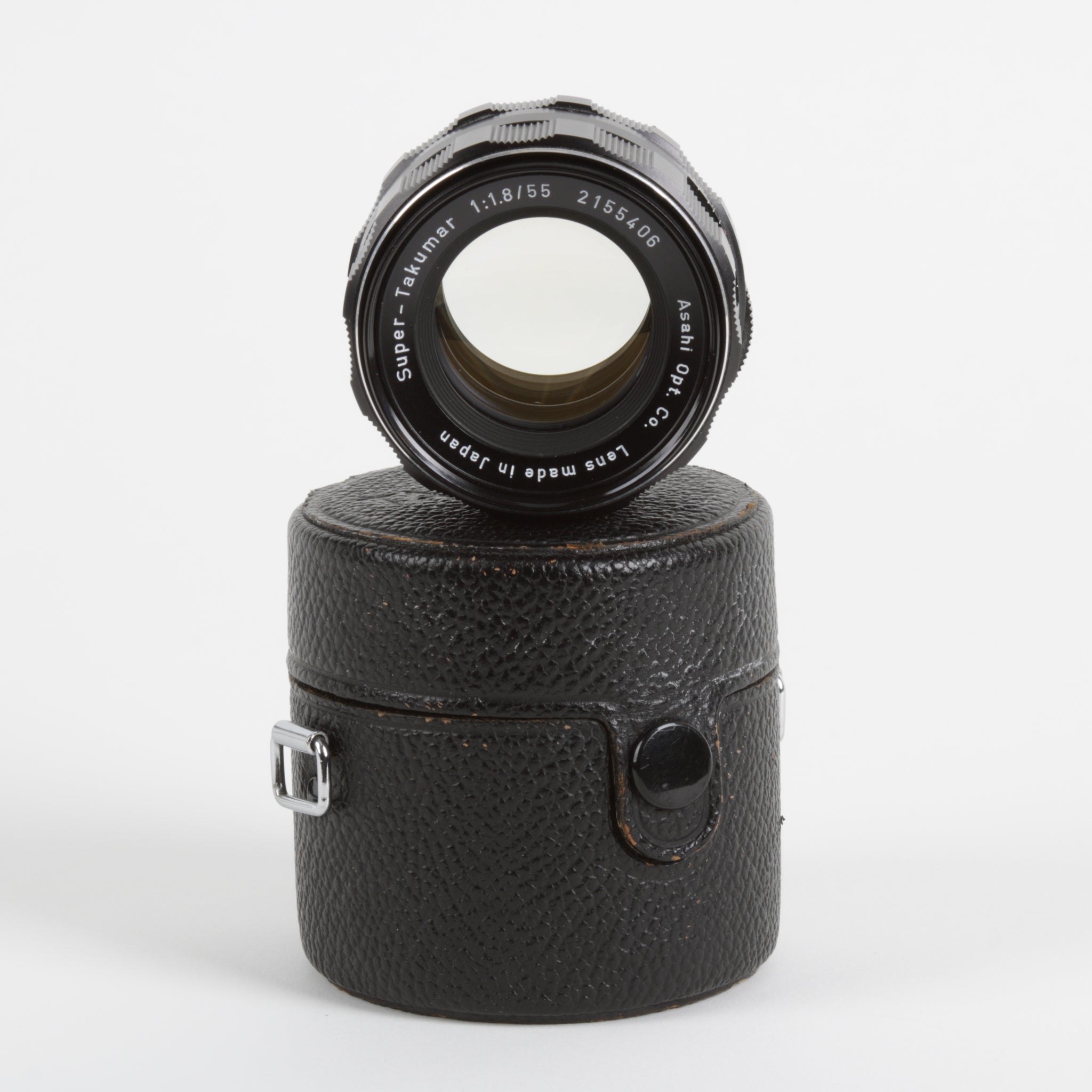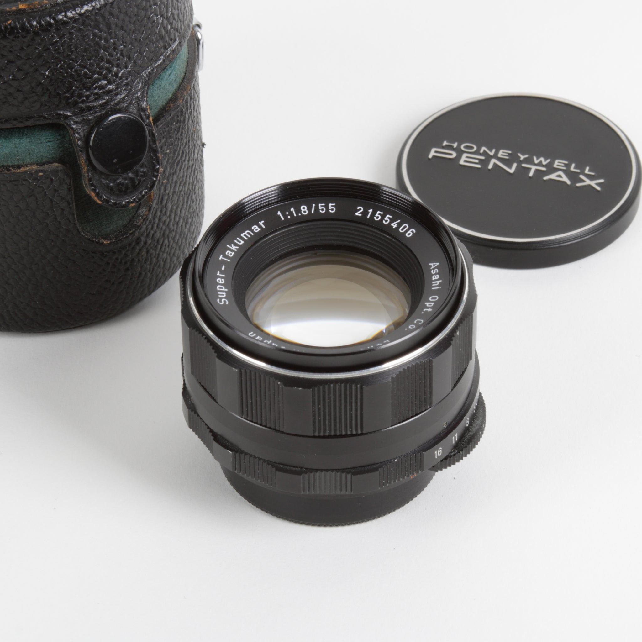 Vintage Pentax Super-Takumar 55mm f1.8 prime lens, with original leather case and caps. The f1.8 was an upgrade OEM lens for the Spotmatic series of SLR cameras. Like the f1.4, the 55mm is known for it's natural colors, tack sharp image quality and painting-like background blur. This version was originally offered between 1962 and 1971 and utilizes thoriated glass, contributing to a light tint to the glass elements.