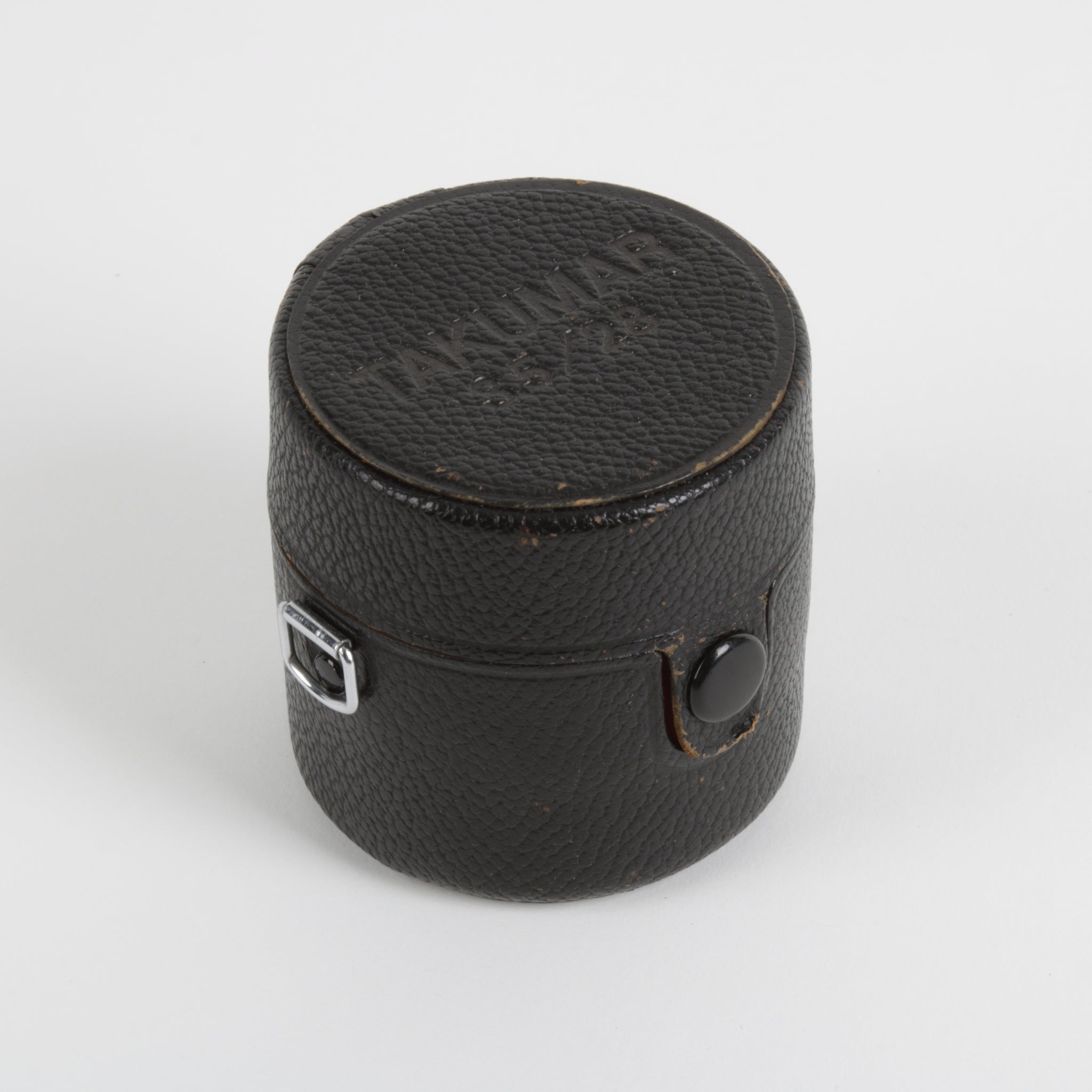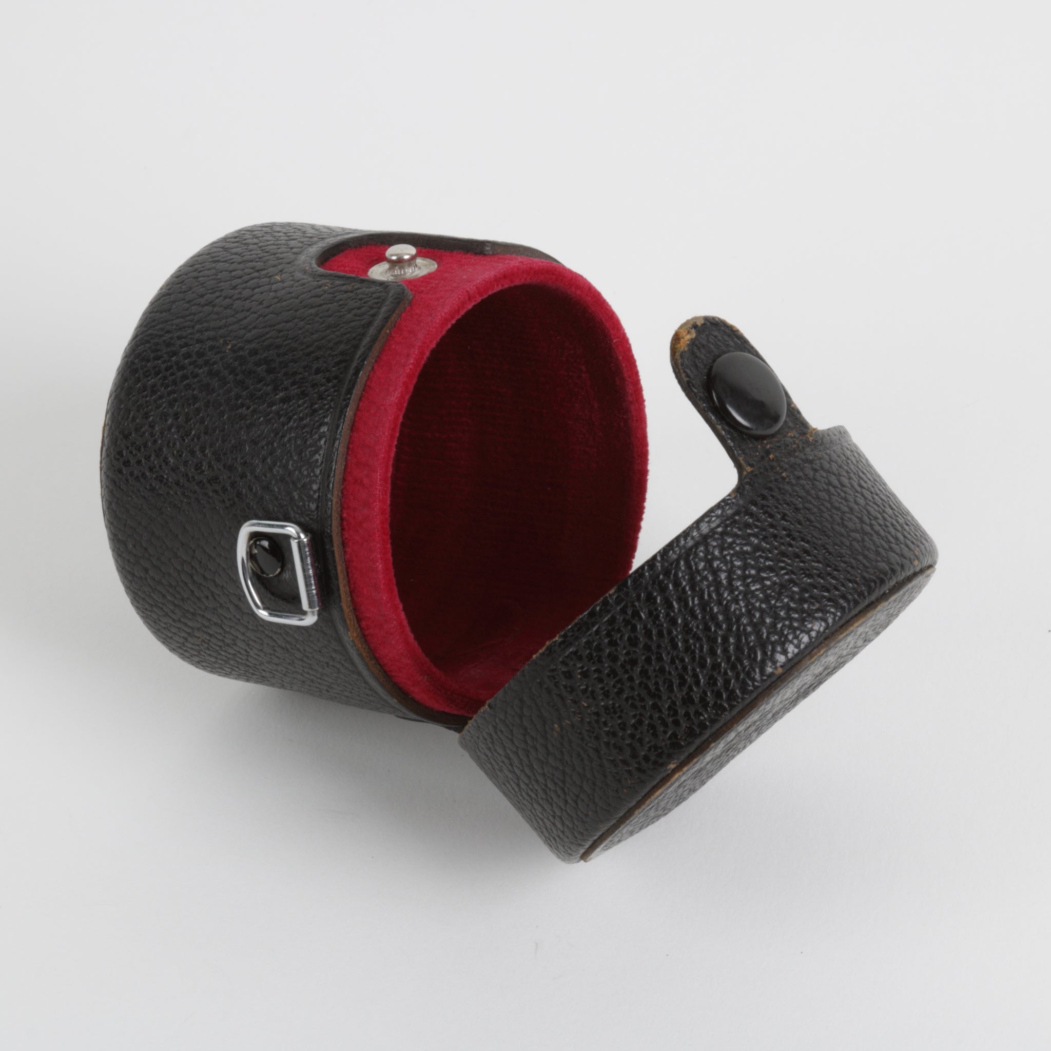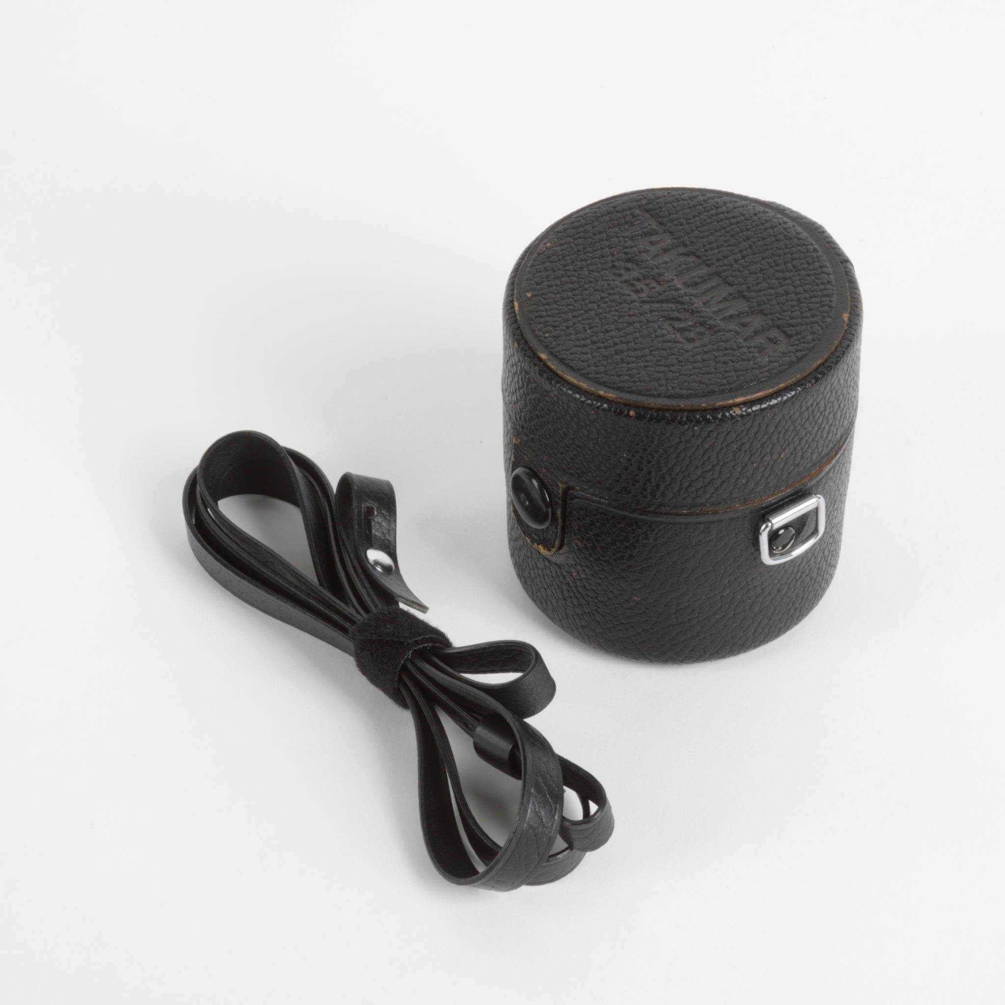 Vintage Pentax Takumar lens case for 28mm, f3.5. Leather shell with plush green liner. Will fit many other compact lenses that use a standard diameter 49mm filter ring. Comes with original vinyl strap, made in Japan by Asahi Optical Company.