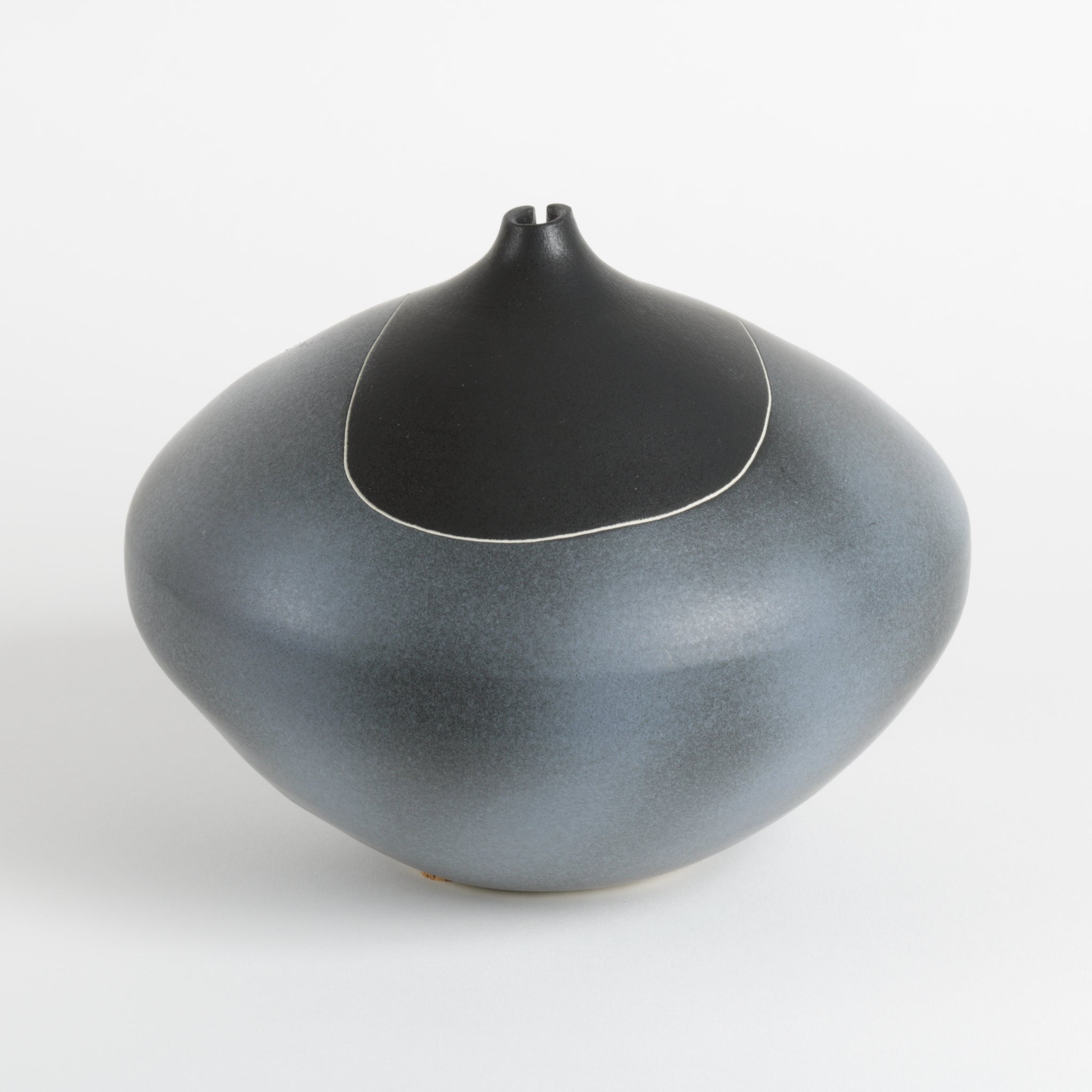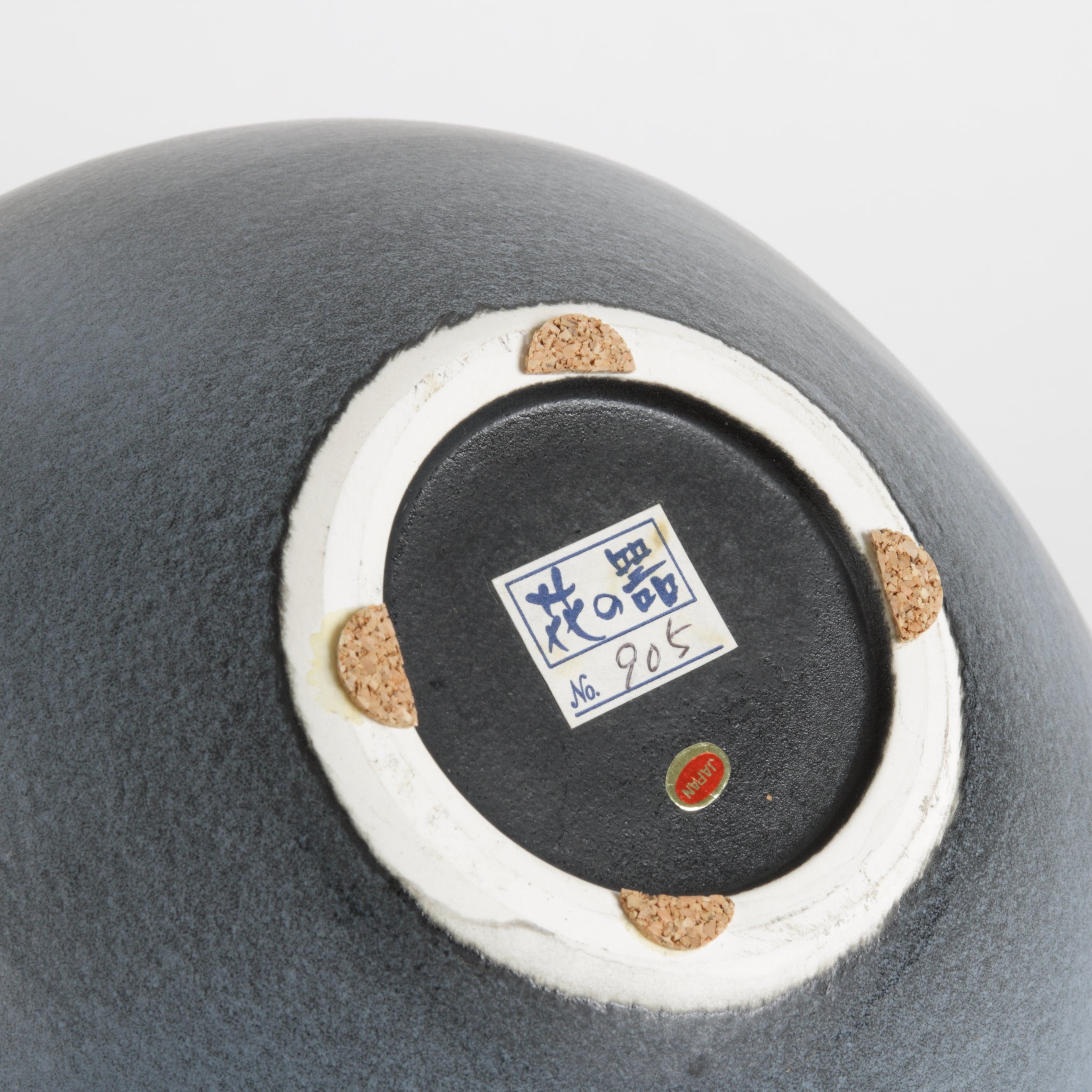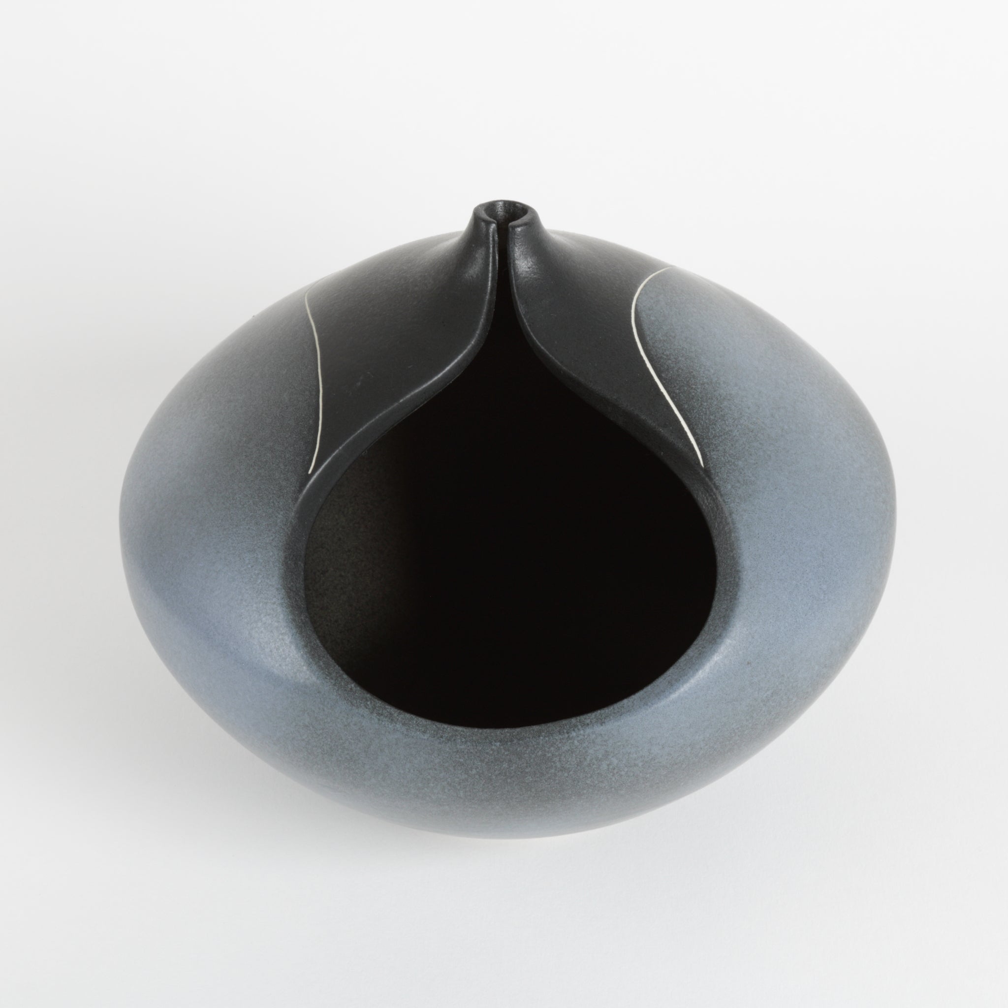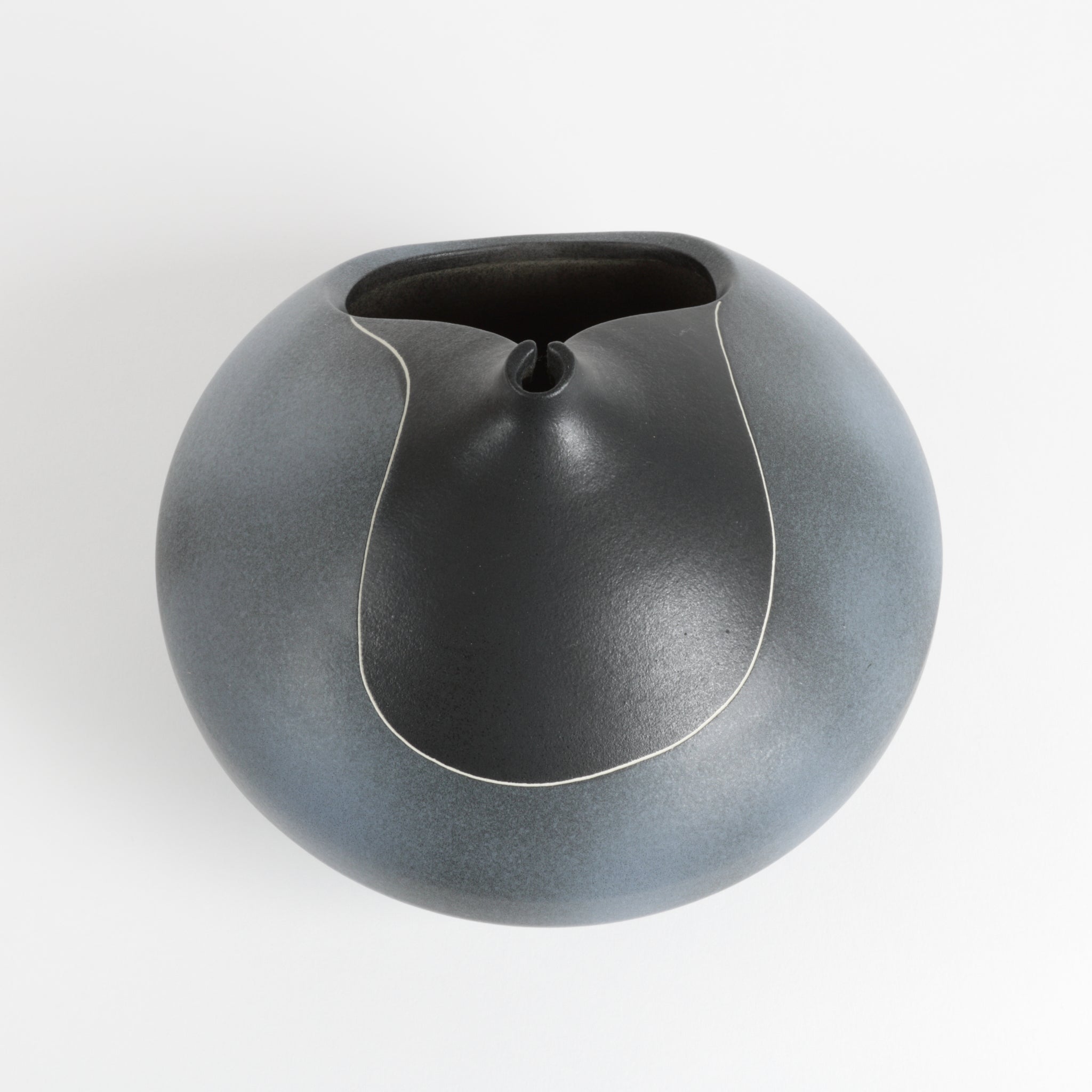 Hand thrown ceramic Ikebana vase in steel blue and dark anthracite glaze. Large side relief with narrowed top design can accommodate a primary stem with protruding lower leafy branches. Matte finish, made in Japan. 'Hana no utsuwa' (flower vessel) no. 905 written on base label.