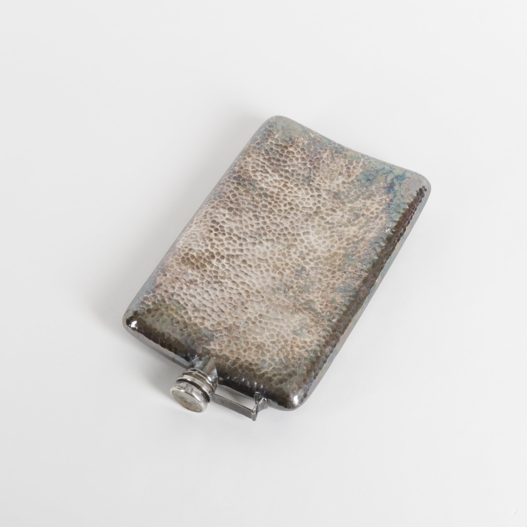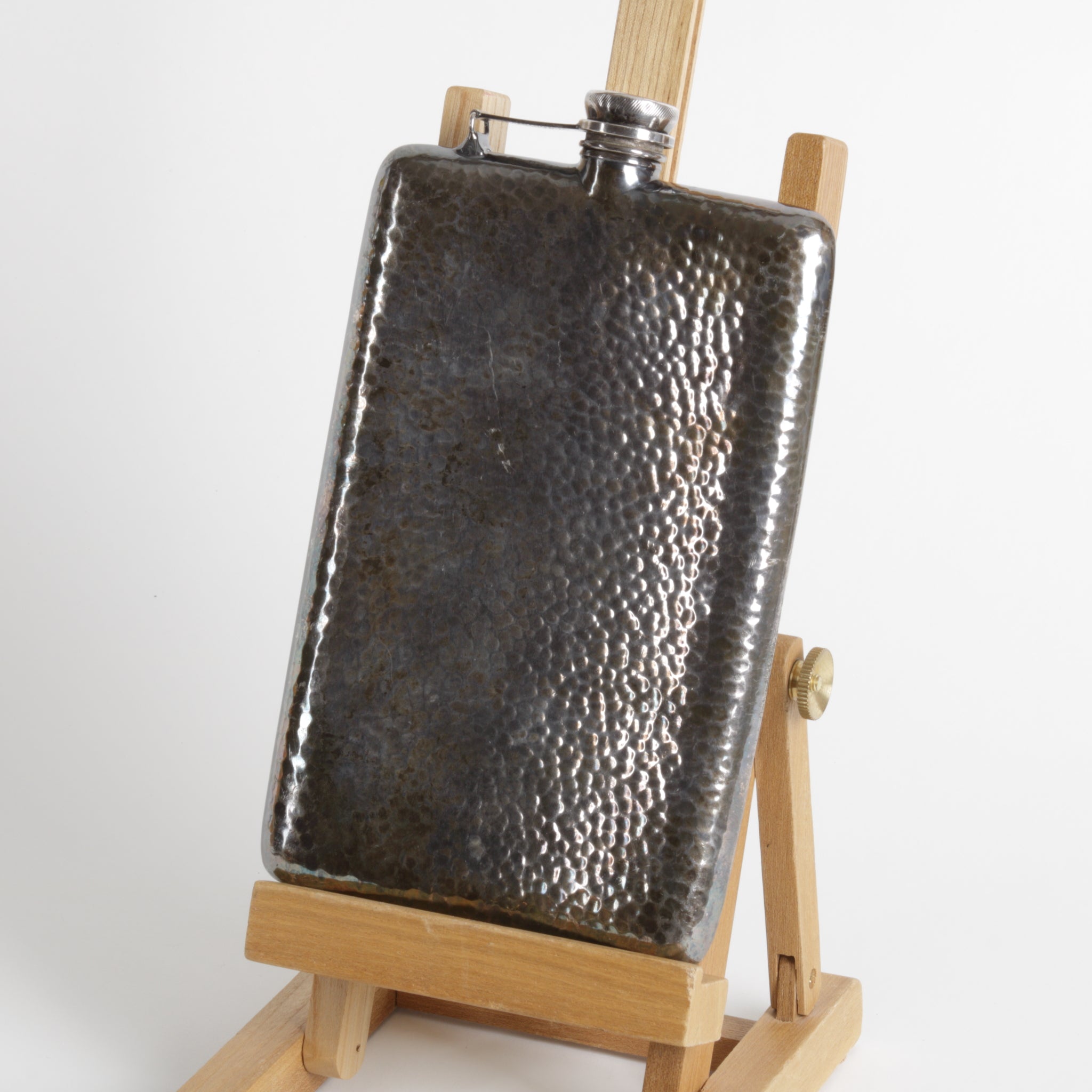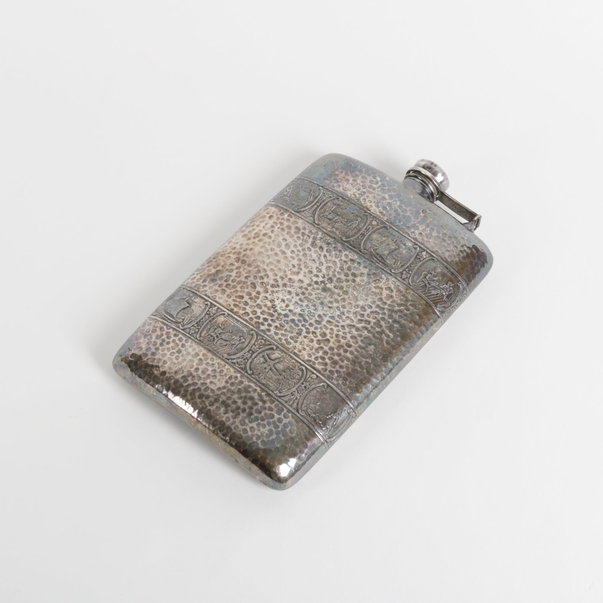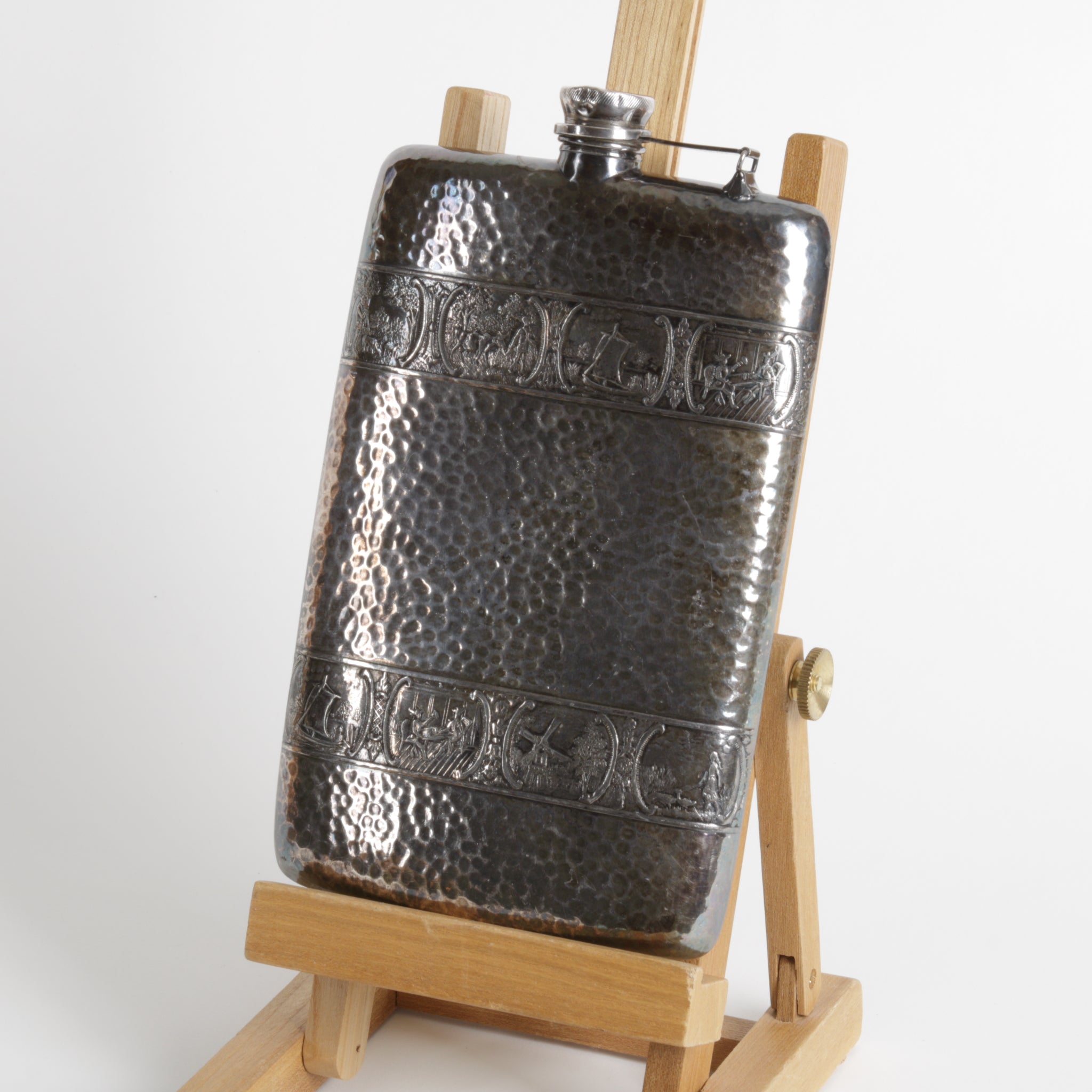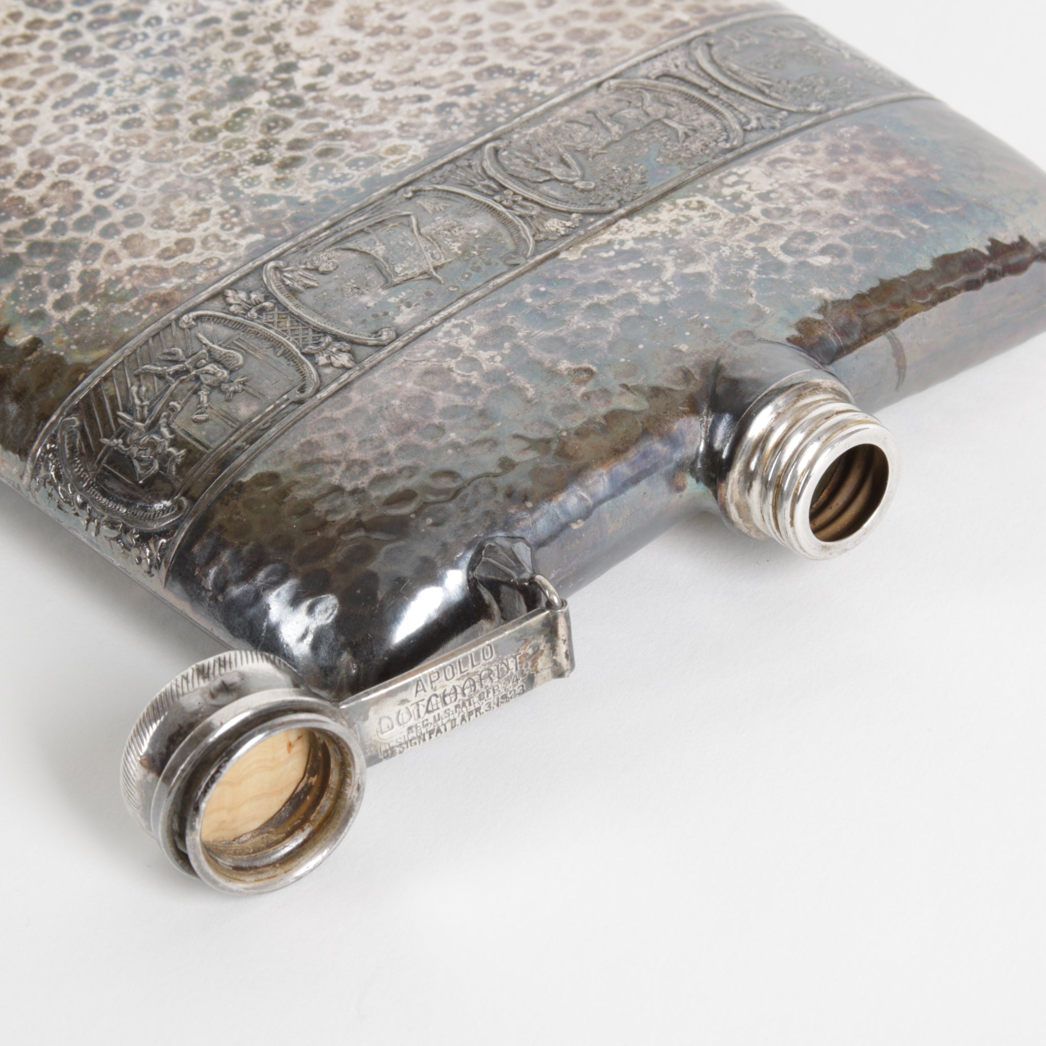 Vintage Apollo Dutchardt / Etchardt flask, silver plating over hand hammered brass. Manufactured from the early 1920's to mid 20th century. Embossed Dutch windmills and Viking ships, hinged screw-on lid, new cork insert. Made in USA by Bernard Rice's Sons, Inc.