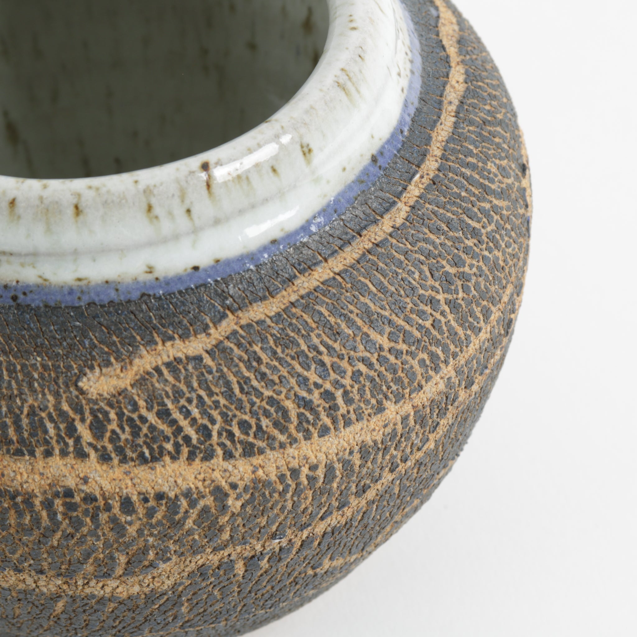 Expanded clay, gloss opaque white and blue rim, darkened clay base. Hand thrown and signed by the artist 'KP / 09'.