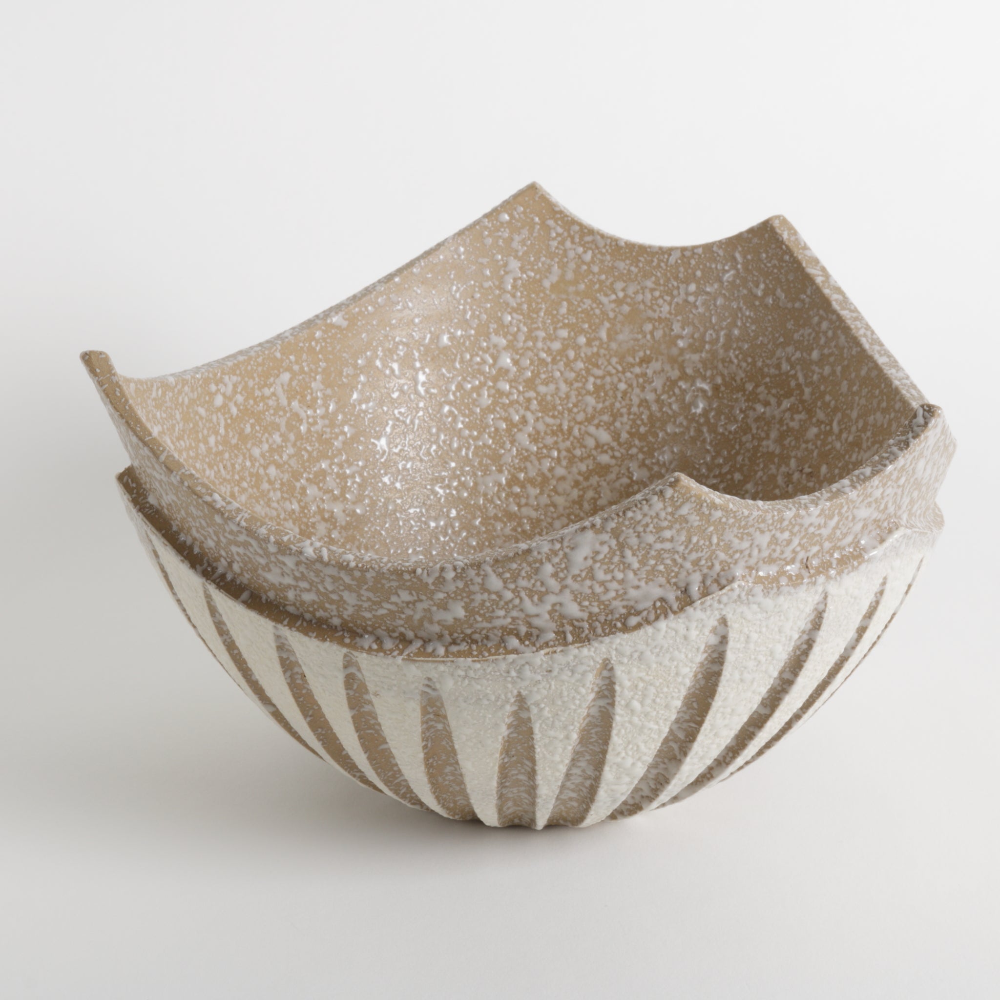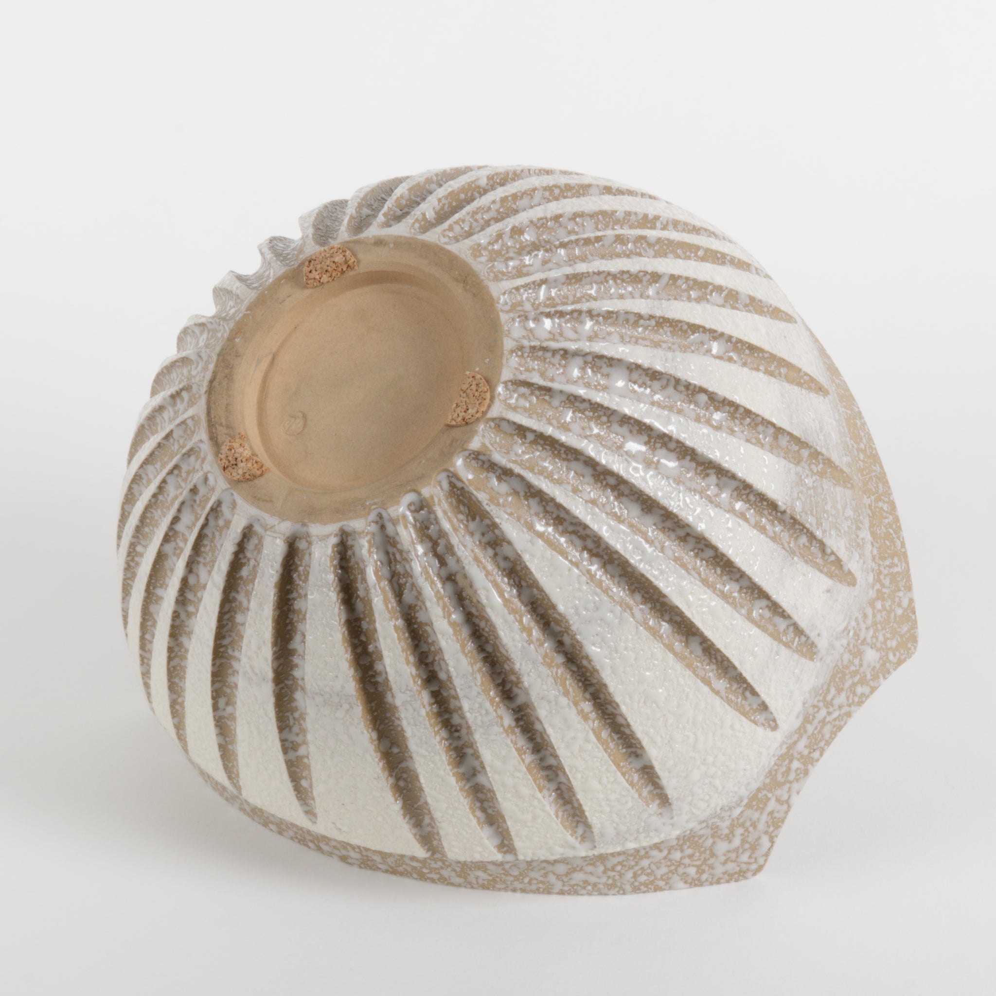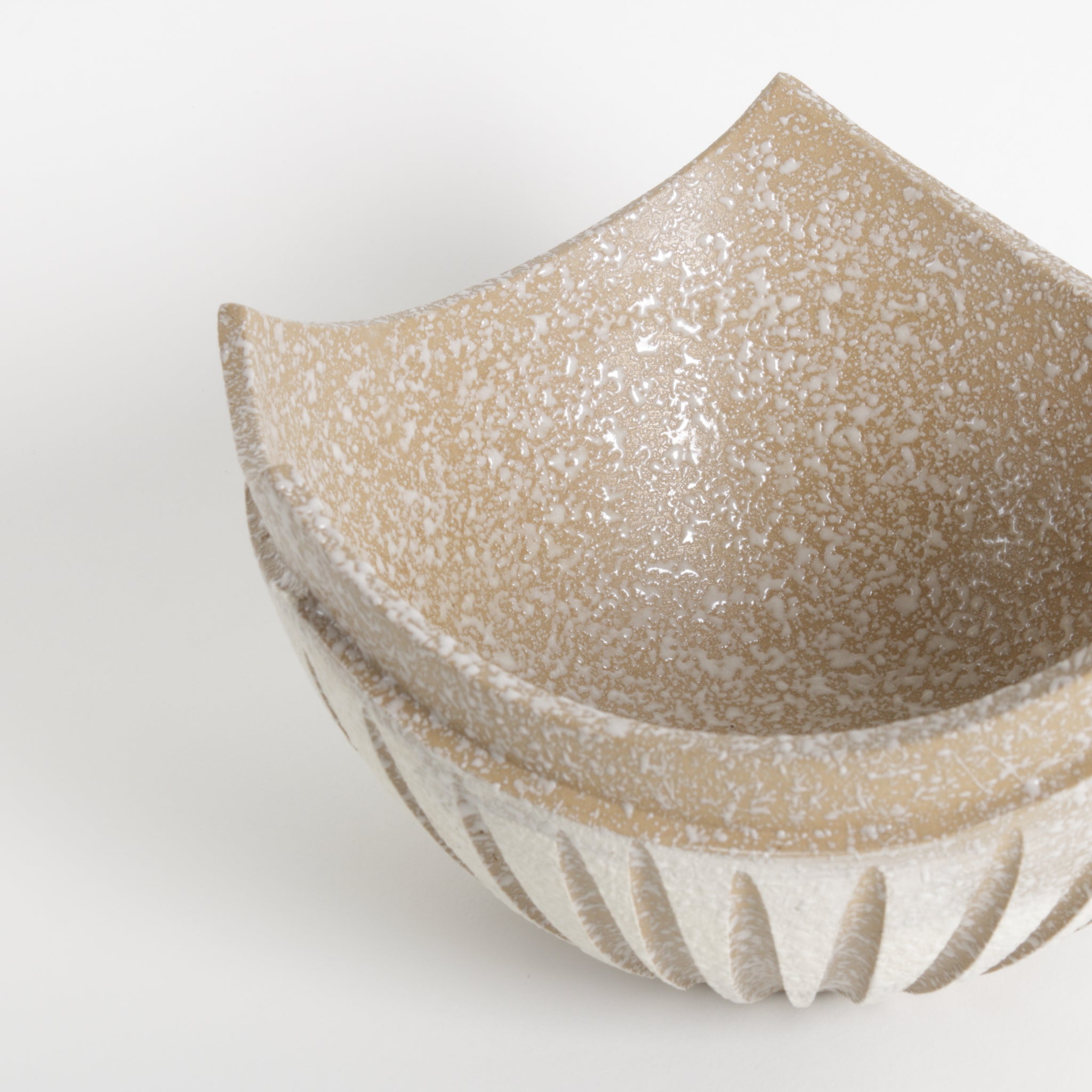 Hand turned Ikebana style studio pottery bowl with recessed lip and carved sides. Speckled white and beige glazes, original stoneware stamped with the makers mark. Made in Japan.