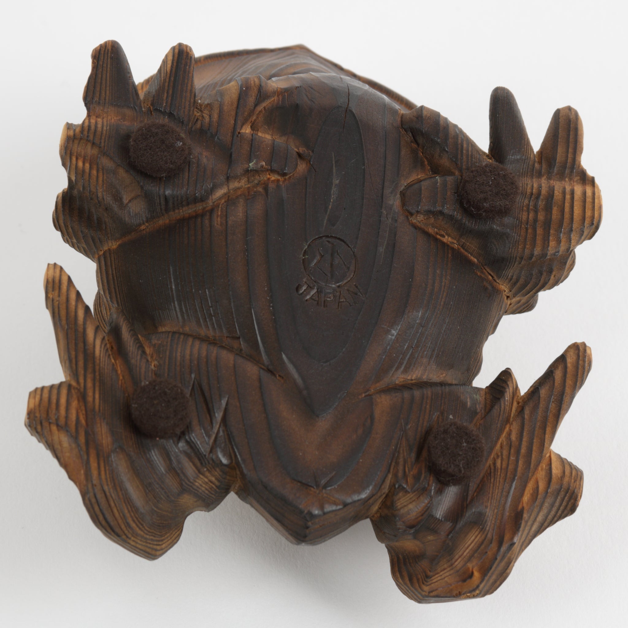 Vintage cryptomeria (Japanese cedar) toad, hand carved, shou sugi ban finish. For good luck. An exceptional example, with new felt pads. Made in Japan.