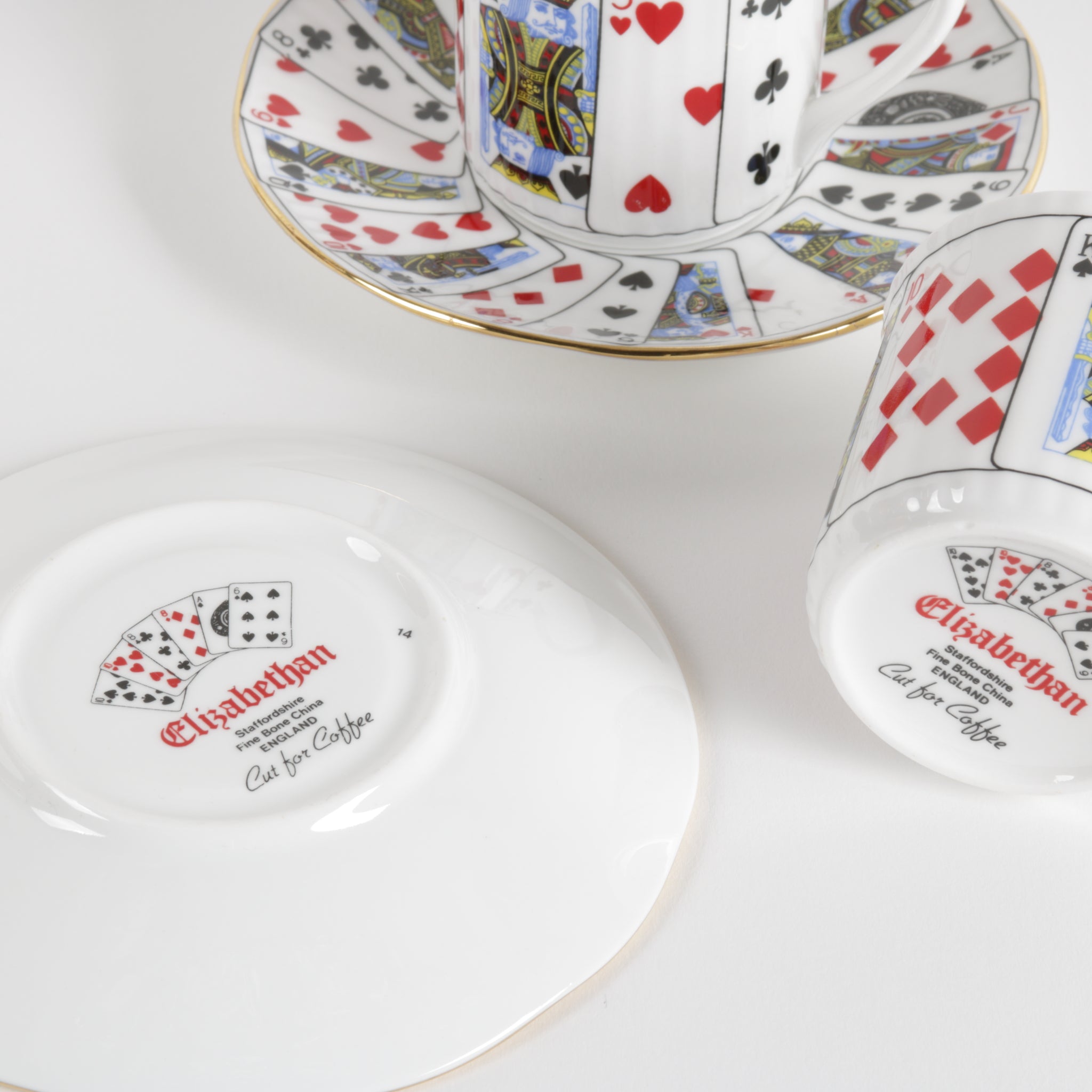 Classic Staffordshire tea cup and saucer set, Elizabethan "Cut for Coffee" playing card design, gold rim. Fine bone china, perfect for coffee, tea or espresso. Set of 2. Made in England.