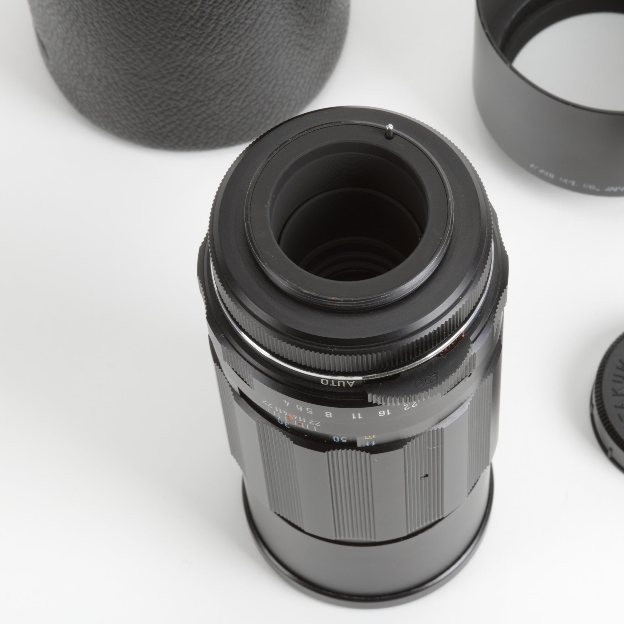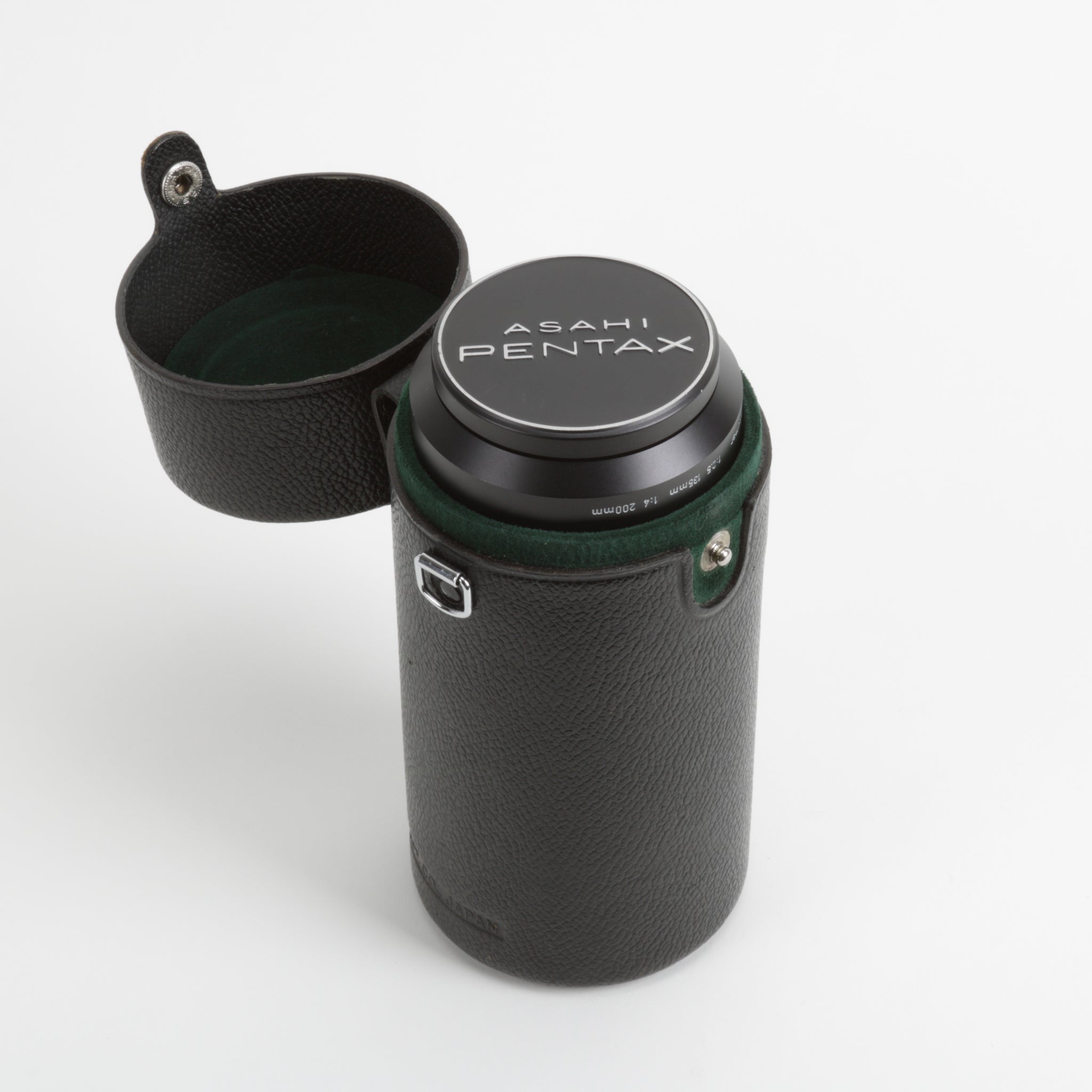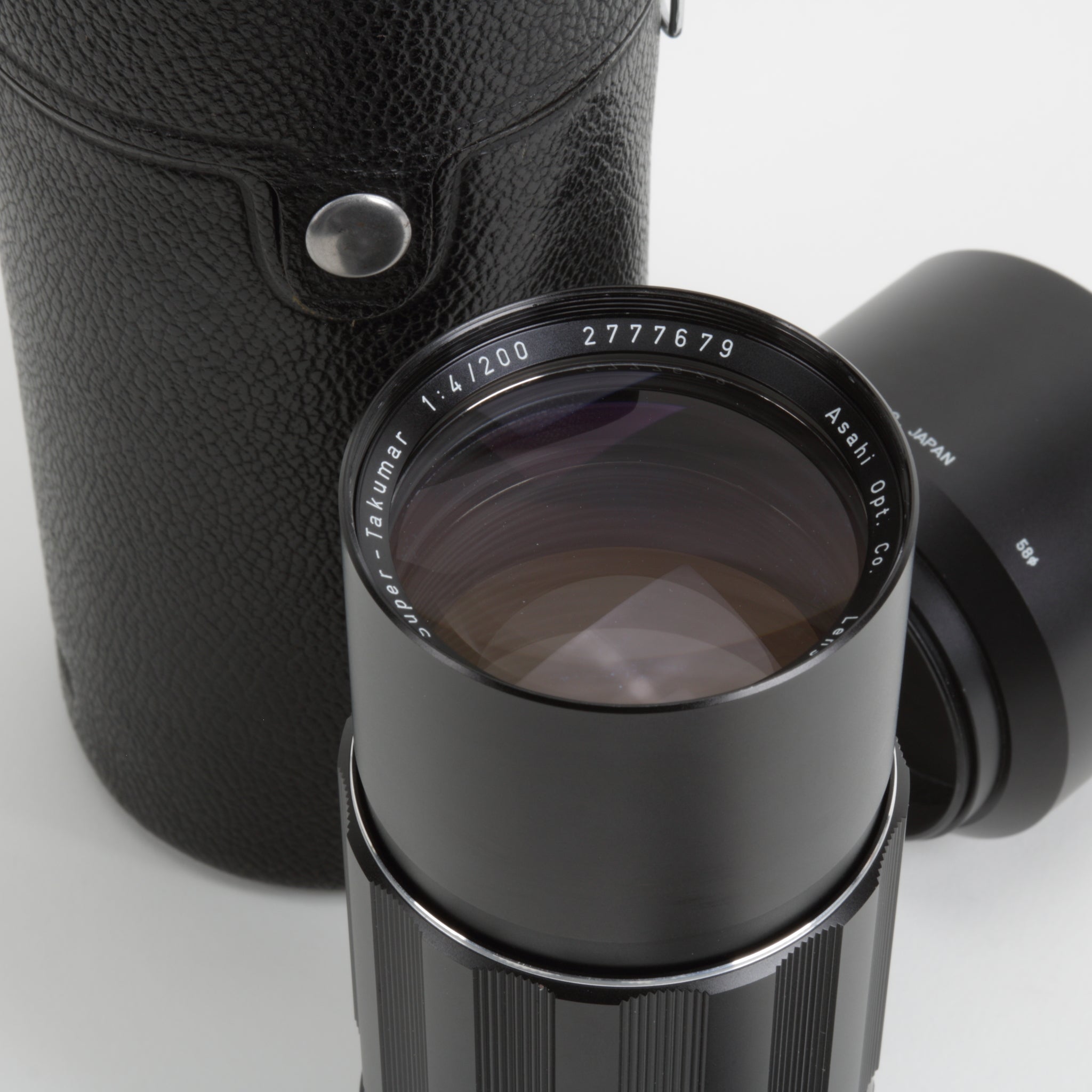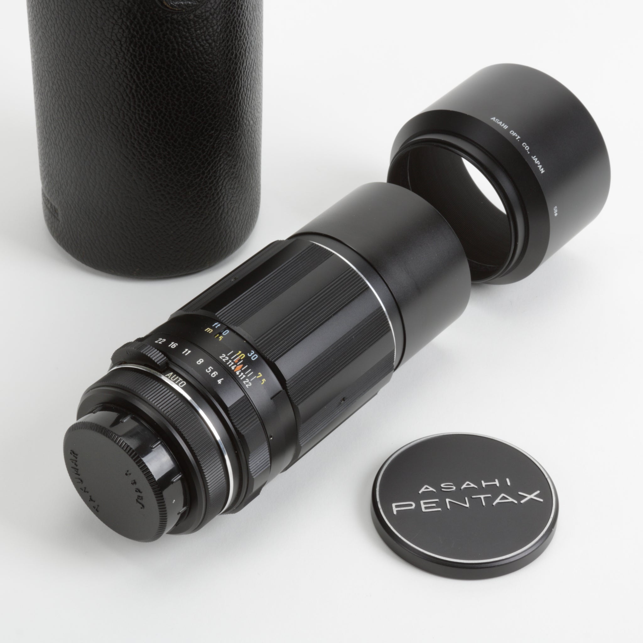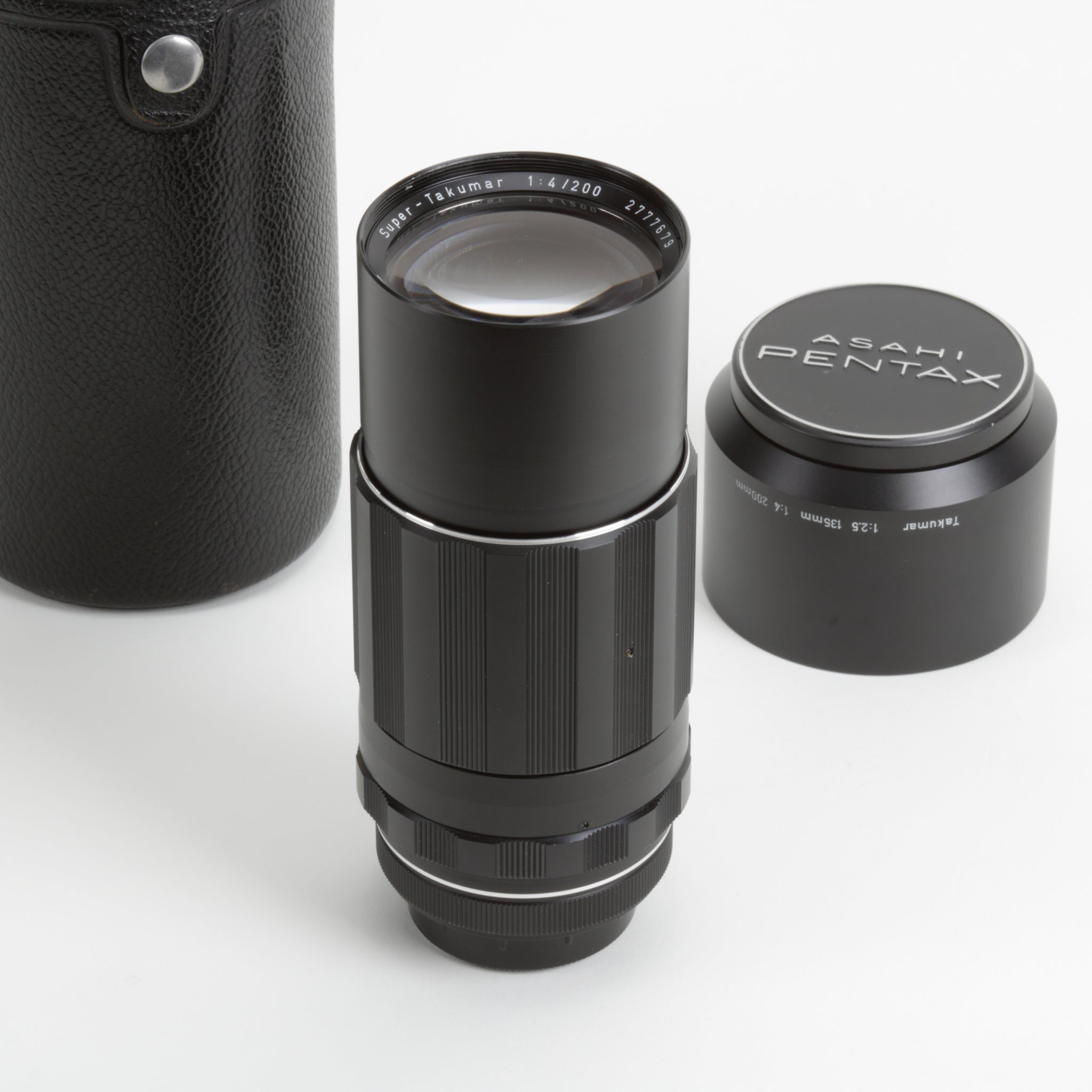 Vintage Pentax Super Takumar 200mm f4 prime telephoto lens. Get closeup with all the quality and feel that makes this lens still relevant nearly 60 years later. Premium coated optics, machined all-metal construction, aluminum flare hood, leather case and original caps. A well preserved example of a classic 200mm lens.
