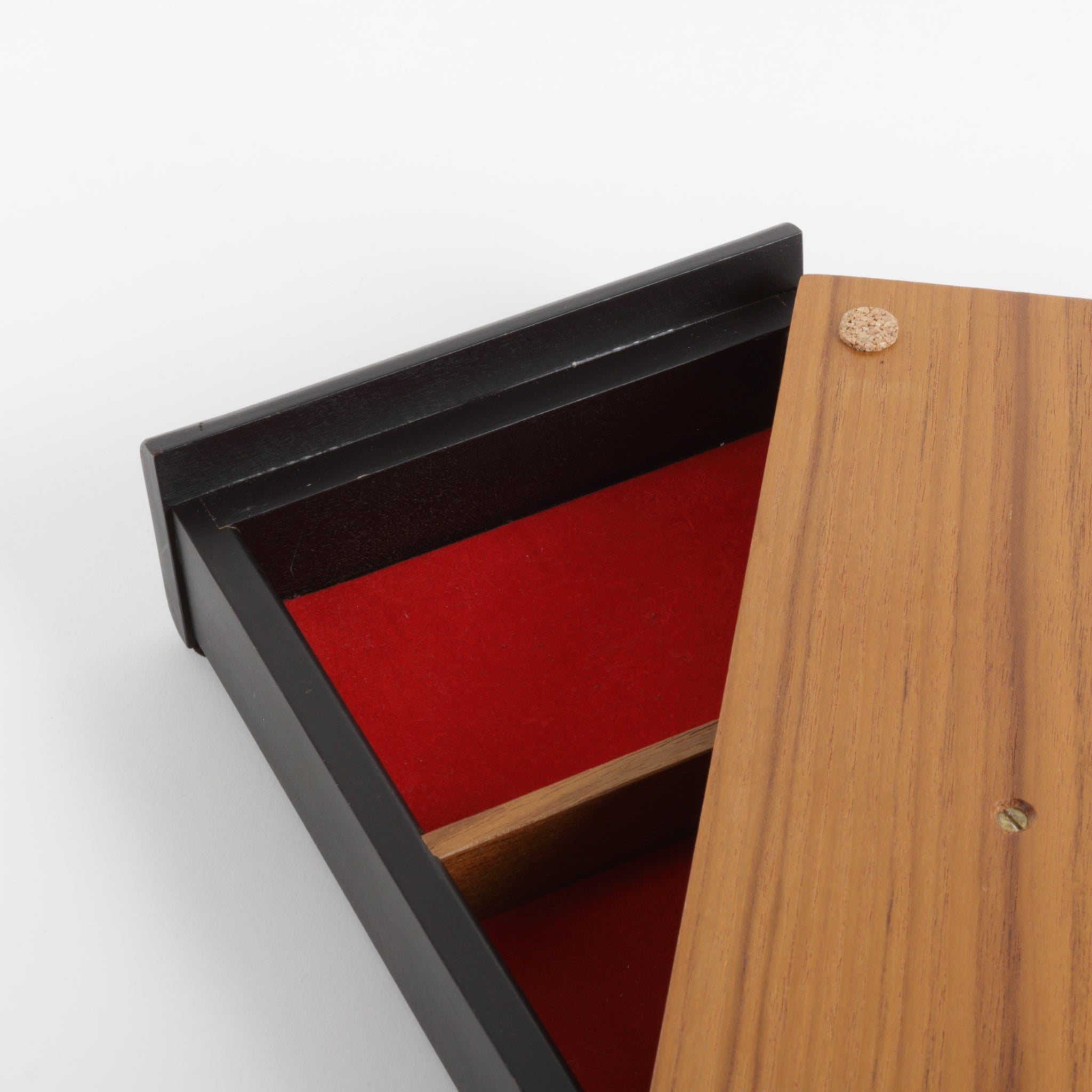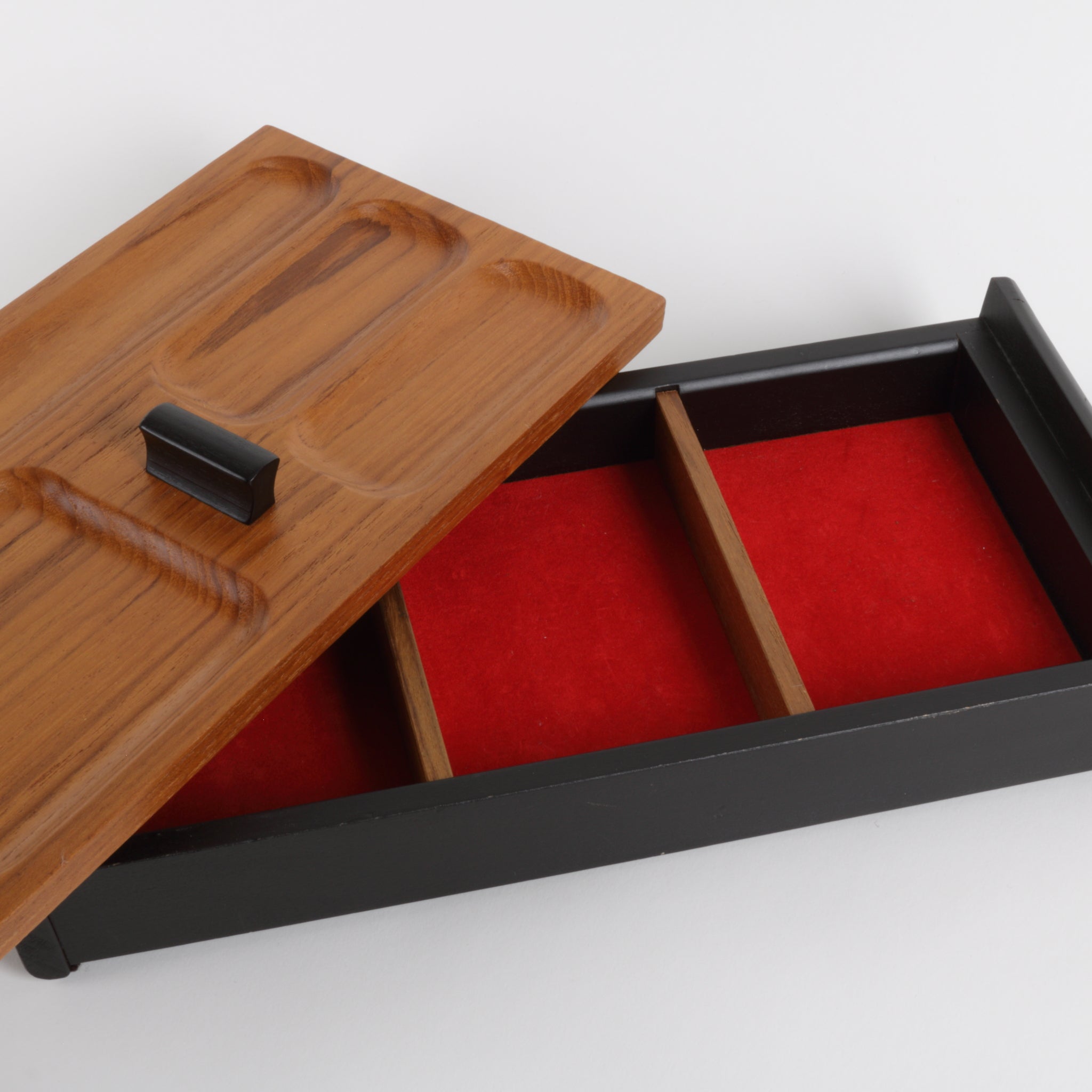 Late mid century modern valet by Swank. Solid wood construction with teak lid, red velvet liner, removable teak dividers. In exceptional condition, made in Japan.