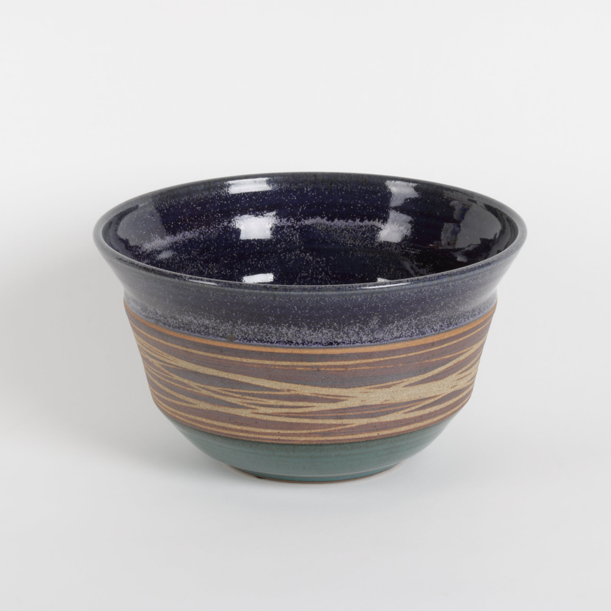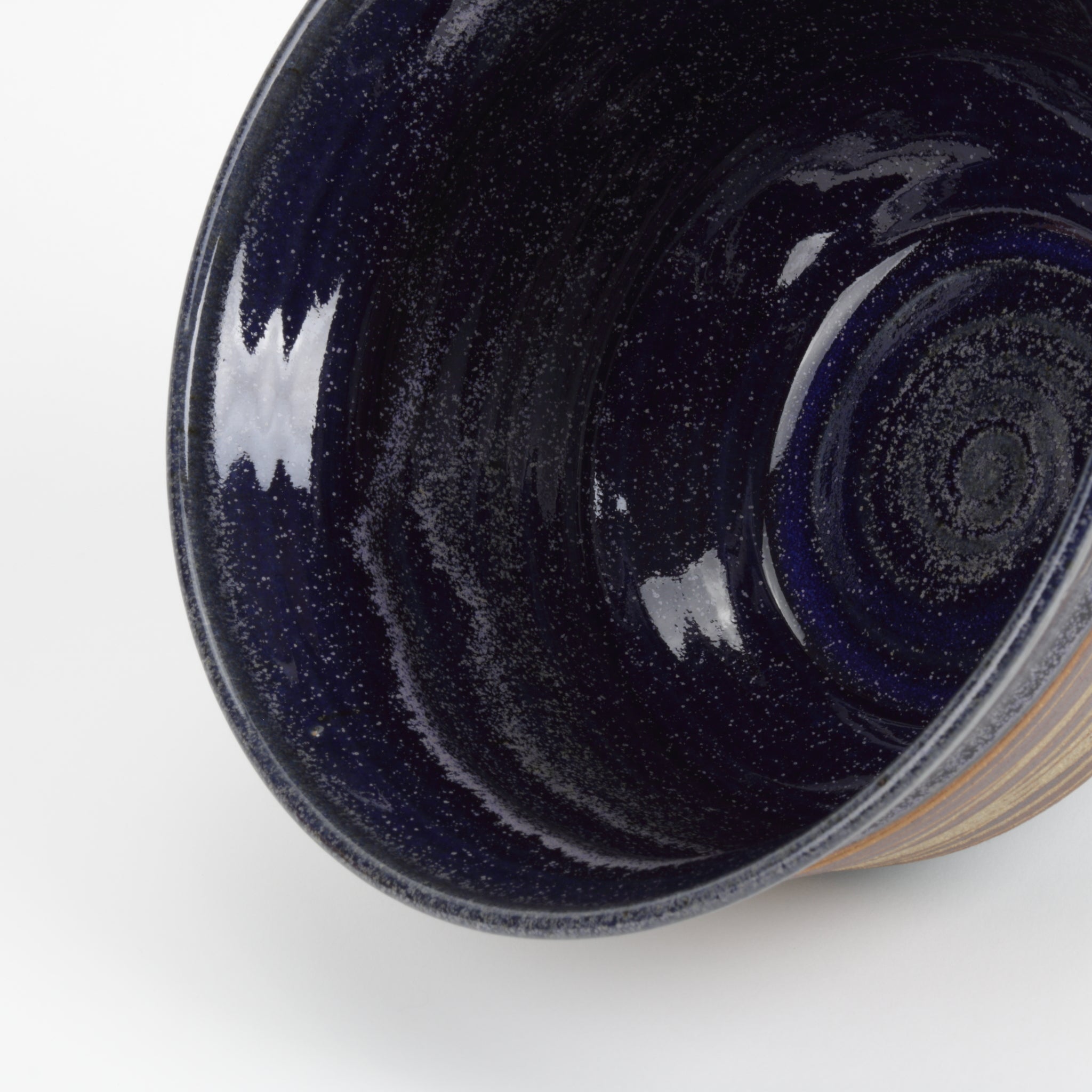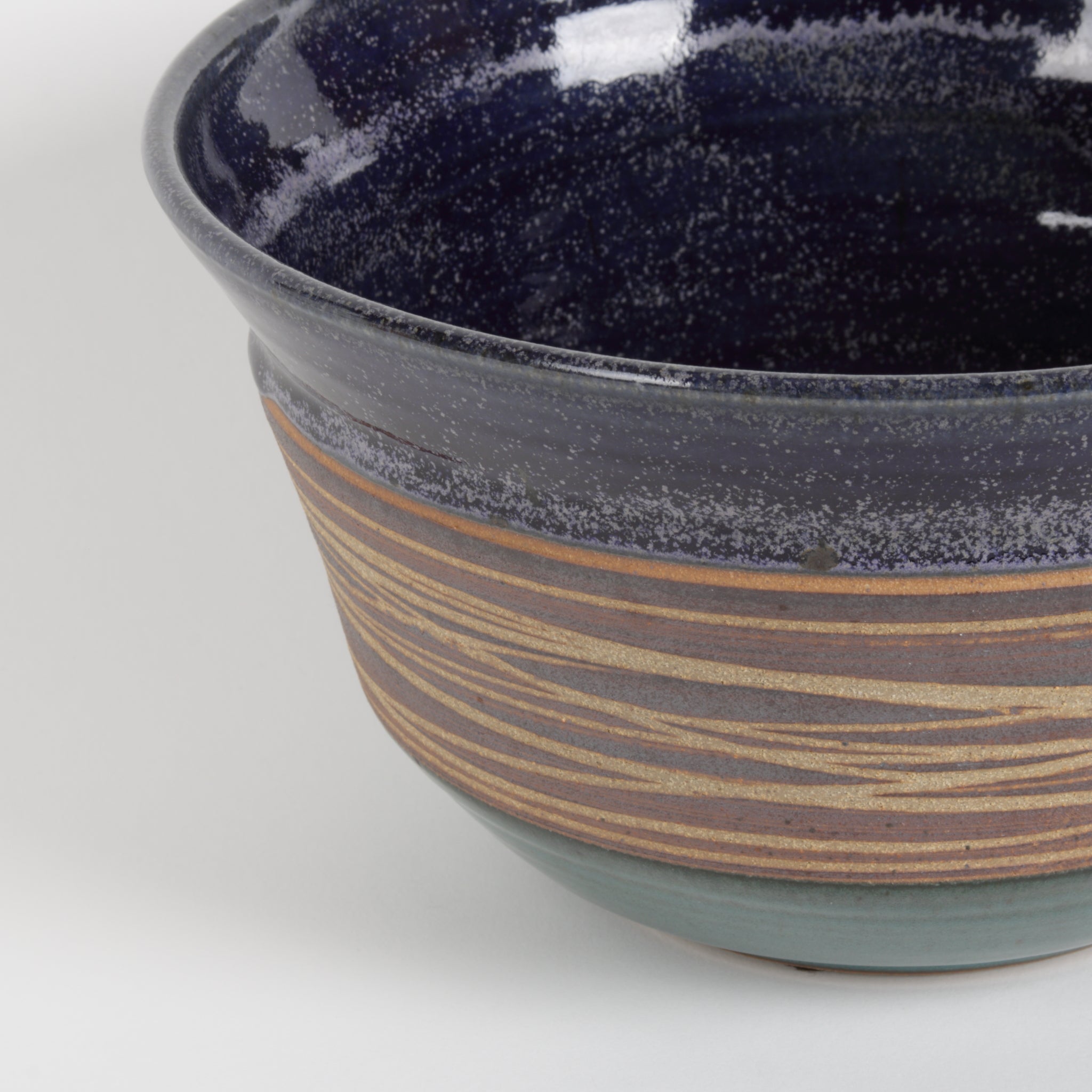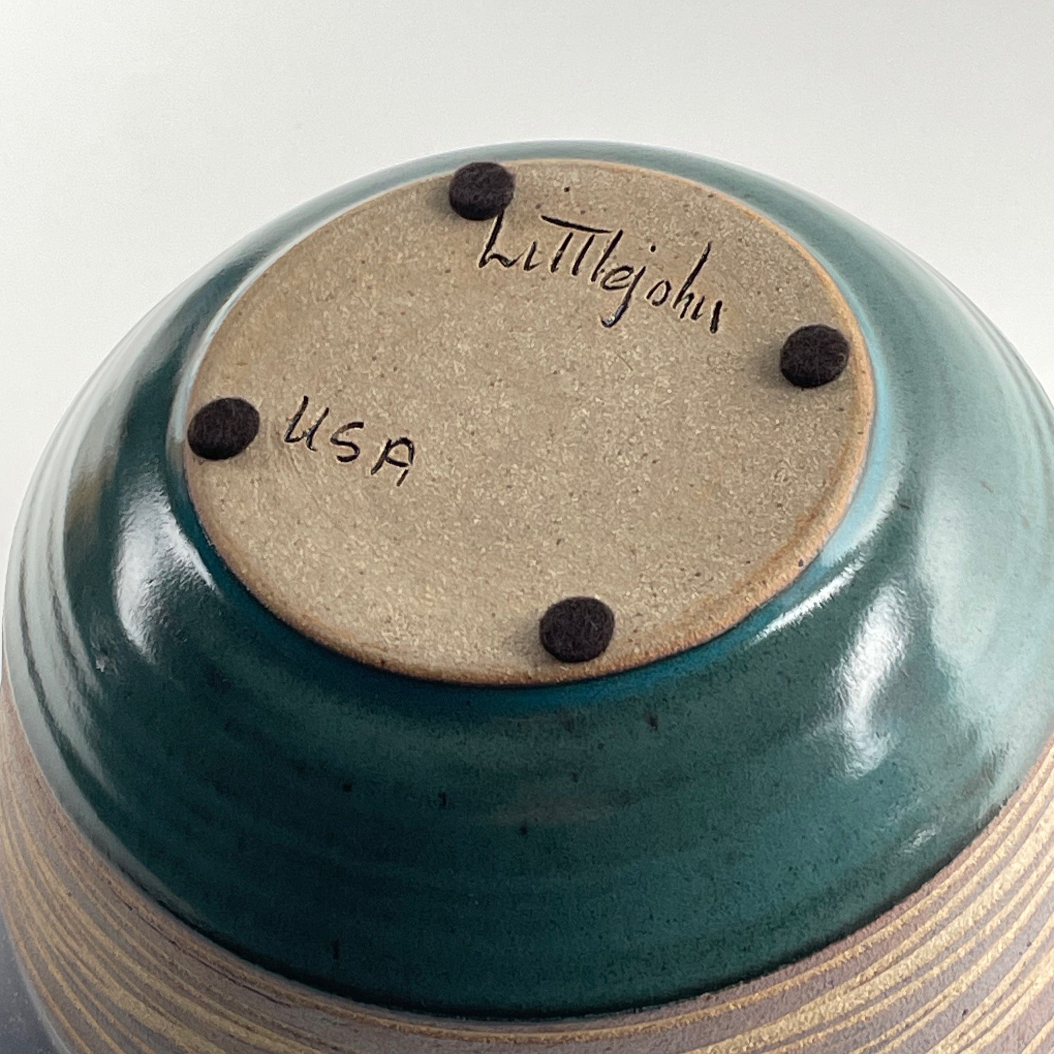 Original studio pottery bowl by Victoria Littlejohn. Hand turned with deep speckled blue, teal green and matte rust glazes. Signed by the artist at base. Made in U.S.A.
